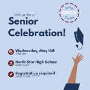 North Star will be honoring our 2025-2026 graduates at our Senior Celebration on Wednesday, May 13th at 7:30 am in the main gym. Graduating students and their families are invited to join us for an informal celebration of our students and their accomplishments and dreams. Registration is required for this event as personalized slides will be created for students based… Read more »